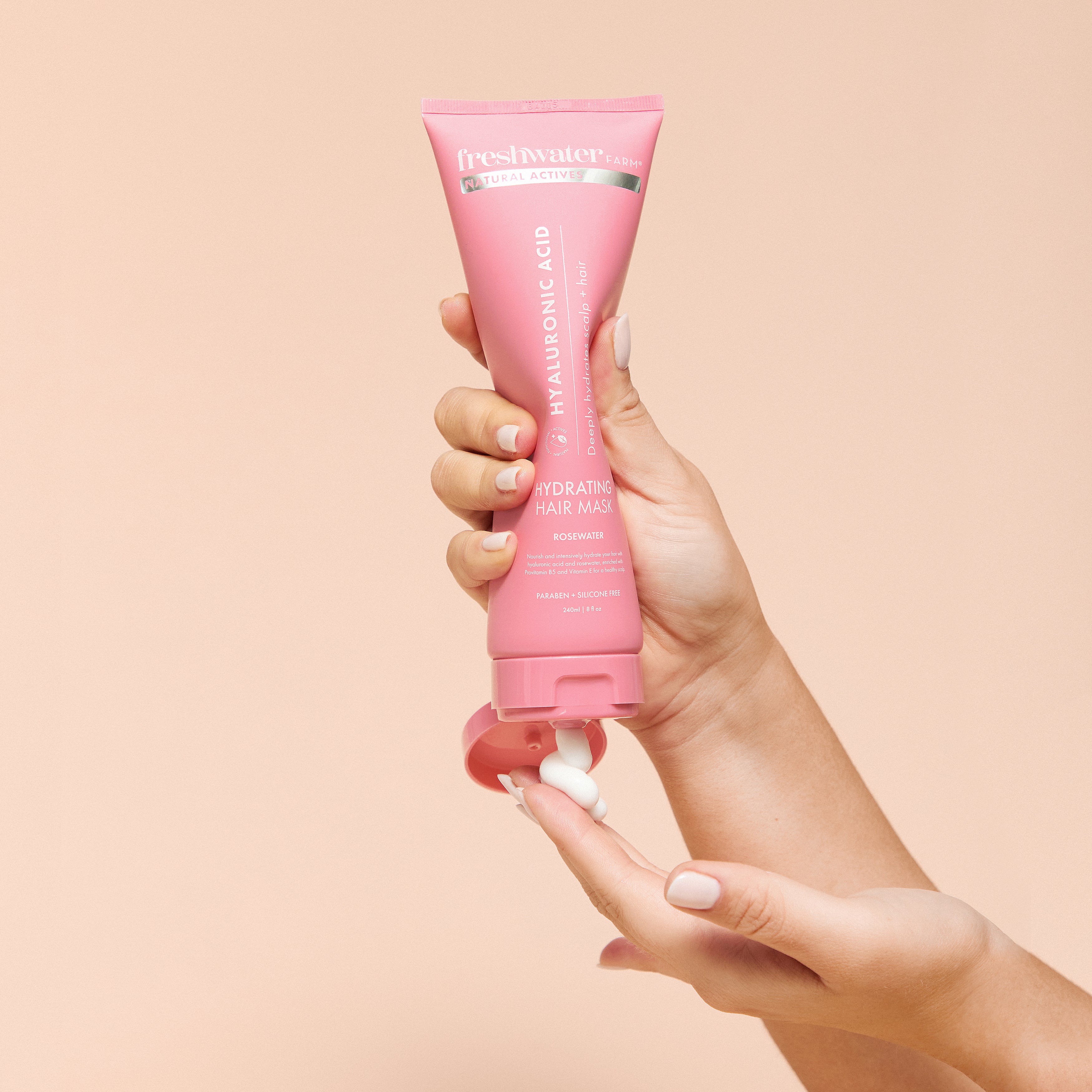 Freshwater Farm Hydrating Hyaluronic haircare range features a rejuvenating shampoo, a deeply nourishing conditioner, and an intensive hair mask, each infused with potent, naturally derived ingredients and delicate rosewater to transform your hair from root to tip.