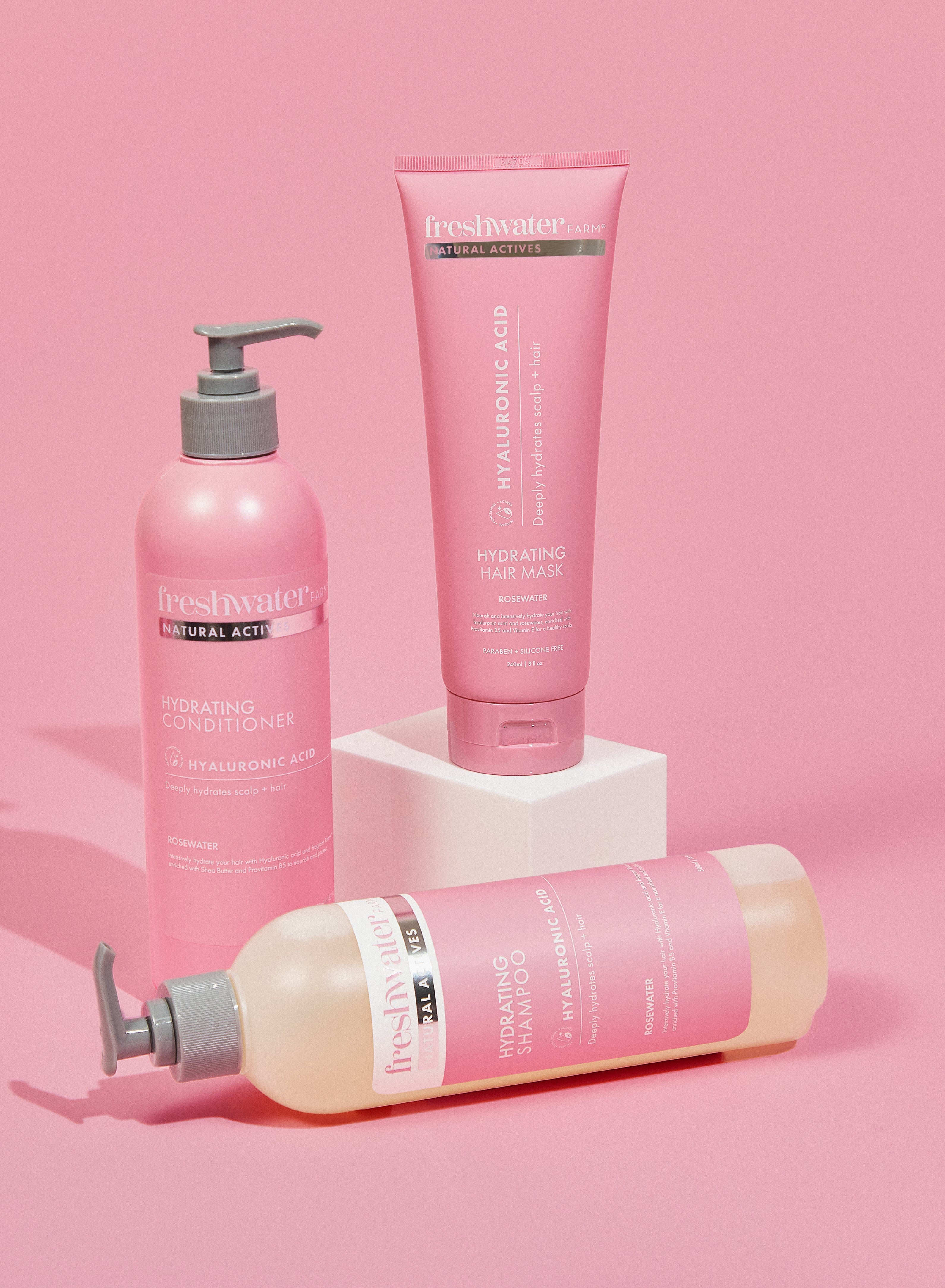 Elevate your hair care routine with the 3-Step Freshwater Farm Hydrating Hyaluronic Hair Care Range, meticulously crafted to provide unparalleled hydration and nourishment.