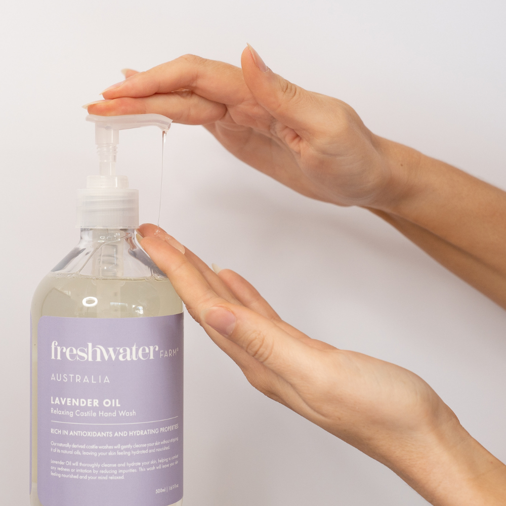Freshwater Farm's naturally derived Australian castile hand washes are designed to quickly rinse away dirt and impurities from your skin, gently cleansing your skin, leaving it hydrated + nourished without stripping it of its natural oils.